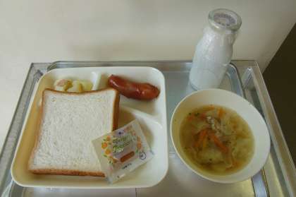 フランクフルトのケチャップソース・スープ・焼きじゃが・食パン・牛乳です。