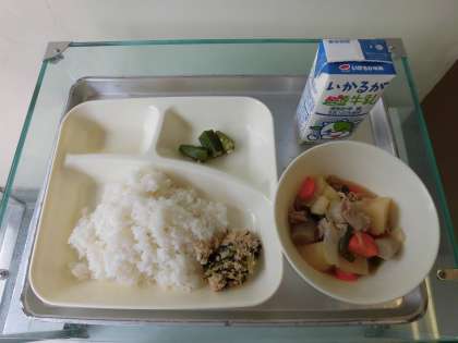 豚肉とじゃがいもの煮もの・オクラの梅風味・ツナっ葉いため・ご飯・牛乳です。
