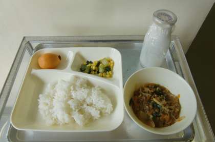 「マーボーはるさめ」は牛挽肉・豚挽肉・はるさめを主材に、トウバンジャンで少し辛みをきかせています。「ごはんがすすむ」といつも好評な献立です。それに年に1度登場する、旬の「びわ」を組み合わせています。