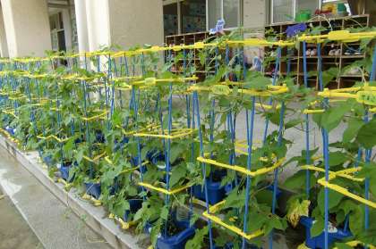 1年生が春に種を蒔いたあさがおが、見事に花を咲かせました。