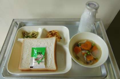 鶏肉と野菜のスープ煮・カレーソテー・りんごのクラフティ・食パン・牛乳