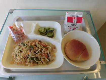 和風焼きそば・きゅうりのゆず風味・黒糖1/2パン・牛乳です。
