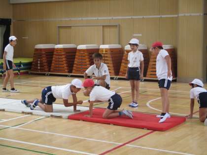 夏のプール水泳も終わり、3年生はこれからマット運動の学習が本格的に始まります。今日教えていただいたポイントを頭に入れて練習し、上達してほしいと思います。