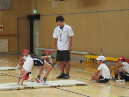 まずは、マット運動の技につながる色々な準備運動をしました。リレーなど楽しい運動もたくさんあり、どの子も笑顔で汗をいっぱいかいていました。