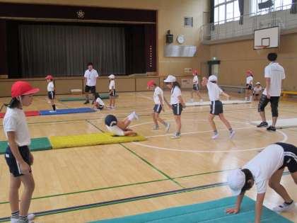 後半は、前転、後転、開脚前転の技のポイントを教えていただきました。1時間だけの出前授業でしたが、マット運動の楽しさに触れることができました。