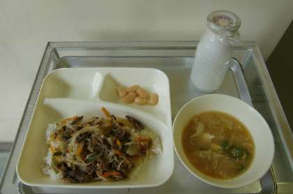 牛丼・みそ汁・大福豆の煮もの・ごはん・牛乳です。