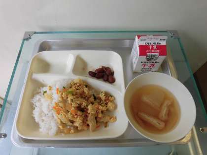 親子丼・とうがんのすまし汁・金時豆の煮もの・ご飯・牛乳です。