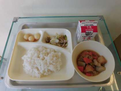 今日の給食は月見の行事献立として、鶏肉とさといもの煮ものとみたらしだんごが出ます。