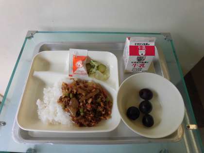 大豆入りキーマカレー・グリーンサラダ・ぶどう(巨峰)・牛乳です。