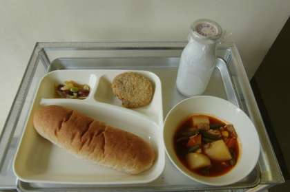 チキンレバーカツ・洋風煮・ビーンズサラダ・ライ麦パン・牛乳