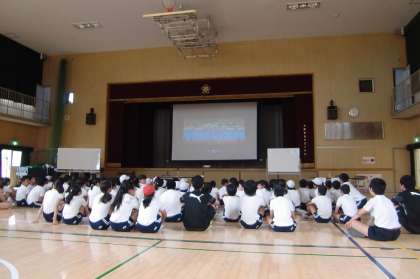 お話の後は小林高之選手も加わり、子どもたちとボールを使ったゲームを行いました。講堂の中は、子どもたちの楽しそうな声が響いていました。