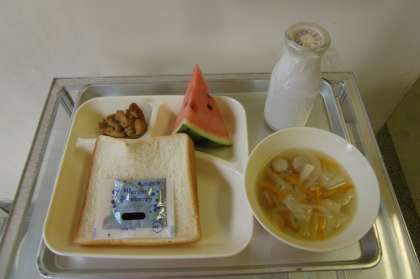 スパイシーチキン・ウインナーとじゃがいものスープ・すいか・食パン・牛乳です。