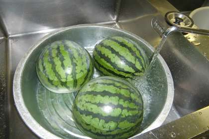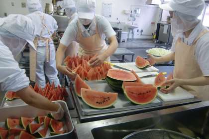 「すいか」は1年に1度登場します。写真は、給食室で大きなすいかを切り分けているところです。