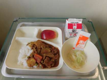 ポークカレーライス[米粉]・キャベツのサラダ・りんご・牛乳です。