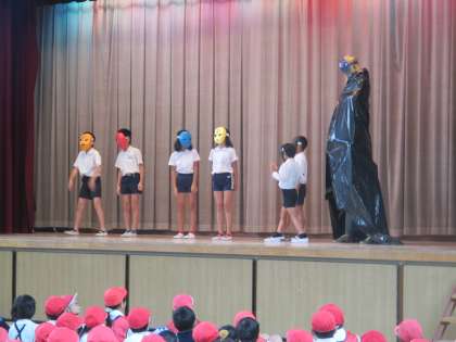児童会代表からは、劇の中で「班長の言うことをきこう!」「廊下は歩こう」「時間を守ろう!」と注意がありました。