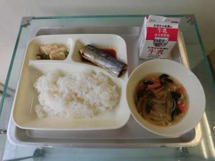 さんまのさんしょう焼き・すまし汁・高野どうふの煮もの・ご飯・牛乳です。