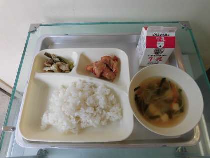鶏肉のチリソース焼き・とうふとワンタンの皮のスープ・中華いため・ご飯・牛乳です。