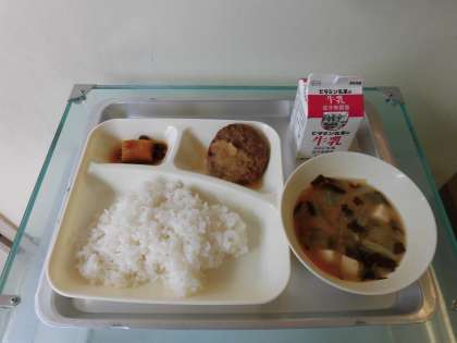 和風おろしハンバーグ・みそ汁・かぼちゃのいとこ煮・ご飯・牛乳です。