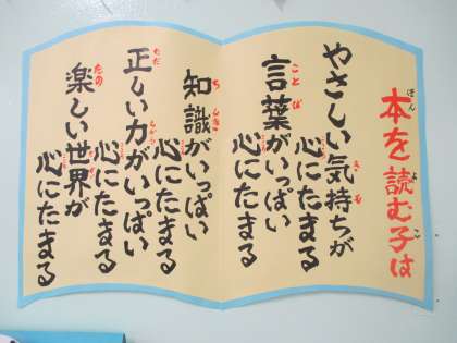 きれいになった図書室に、元片江小学校の教頭先生で「ゆずりは Book Bookの会」の一員でもある 堀 薫先生が、掲示物を作ってくださいました。図書室の前や、部屋の中に飾ってあるので、また子どもたちにも読んでほしいです。