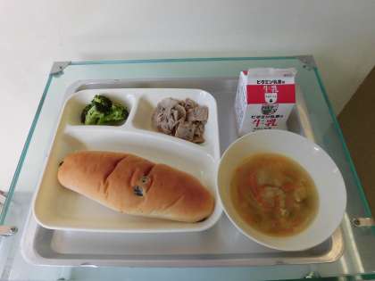 豚肉のガーリック焼き・マカロニと野菜のスープ・ブロッコリーのサラダ・レーズンパン・牛乳です。