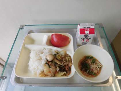 中華丼・もやしの中華あえ・りんご・牛乳です。
