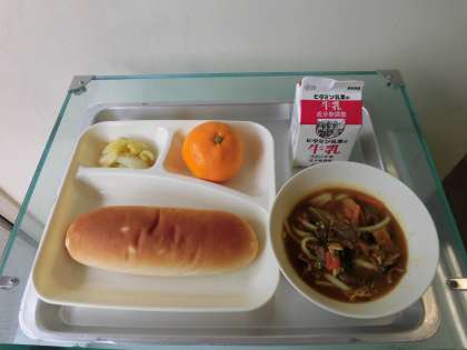 カレーうどん・はくさいのおひたし・みかん・おさつパン・牛乳です。