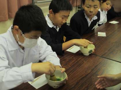 最後は、各クラスとも代表の5人だけですが、お茶をたてる体験をさせていただきました。茶筅を持ってお茶をたてる友達をみんな羨ましそうに見ていました。