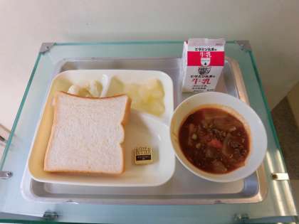 ビーフシチュー・カリフラワーのピクルス・和なし(缶)・食パン・牛乳です。