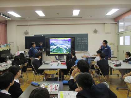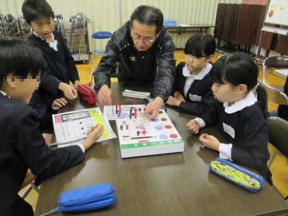 初めに、「暮らしの中の電気」ということで、私たちの生活に欠かせない電気が、どこでどのように作られ、どのようにして届けられているのかを教えていただきました。電気が電線の中を伝わる速さは、光のスピードと同じだそうです。発電所で作られた電気は、すぐさま送電線、配電線を通り、作りたての電気が私たちの家にやってきます。