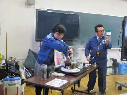 「発電所のしくみ」の話では、実際に蒸気の力でタービンを回し、発電するところを実験で見ることができました。目の前の実験を見ることで、火力発電所のしくみがよくわかりました。その他、水力発電や原子力発電のしくみも、丁寧に教えていただきました。