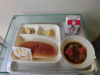 ミートボールと野菜のカレー煮・ツナとキャベツのソテー・焼きじゃが・大型コッペパン・牛乳です。
