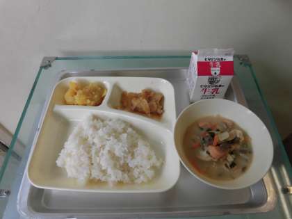 鶏肉の甘辛焼き・かす汁・くりきんとん・ご飯・牛乳です。