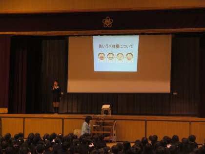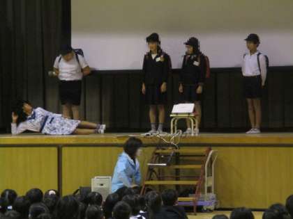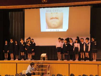 本年度、片江小学校で全校児童が6月・11月・1月に取り組んできた「あいうべ体操」。口の周りの筋肉を鍛えて、鼻呼吸ができるようになるためにやってきましたが、鼻呼吸が大切な理由を低学年にもわかりやすく健康委員の5・6年生が劇を交えて教えてくれました。