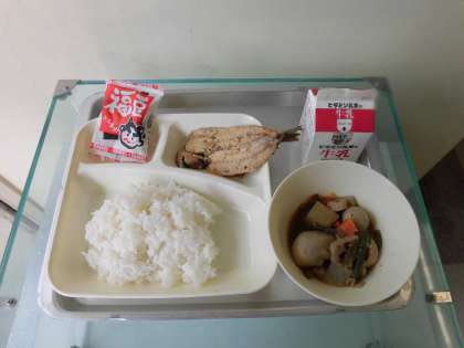 給食では、節分の行事献立として「いわしのしょうがじょうゆかけ」と「いり大豆」が出ます。