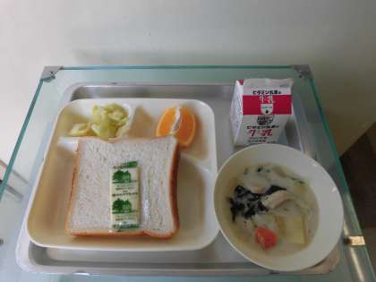 ほうれん草のクリームシチュー・キャベツのサラダ・いよかん・食パン・牛乳です。