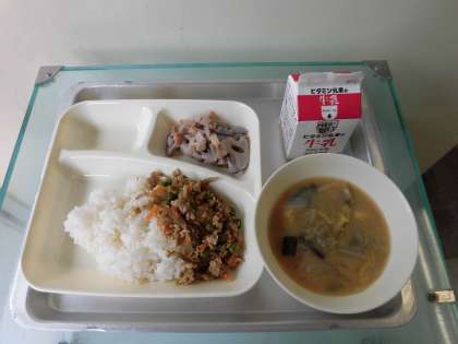 鶏ごぼうご飯・干しずいきのみそ汁・焼きれんこん・牛乳です。