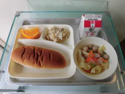 押し麦のグラタン・スープ・デコポン・黒糖パン・牛乳です。