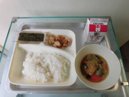 あげ鶏のねぎソースかけ・あつあげとはくさいの中華煮・焼きのり・ご飯・牛乳です。