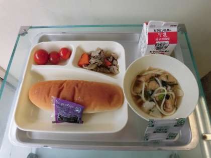 豚肉とごぼうの煮もの・なにわうどん・プチトマト・大型コッペパン・牛乳です。