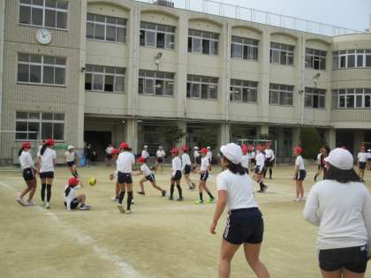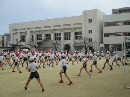 これは、卒業前の6年生が、5年生とドッジボールの試合をする毎年恒例の行事です。高学年2学年が運動場で準備運動をすると、本当に運動場が狭く見えます。