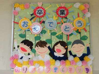 卒業を祝う掲示物が校内にたくさん飾ってあります。