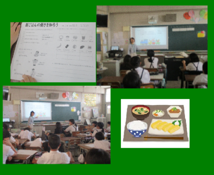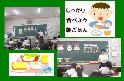朝ごはんには学校で元気に過ごすための、とっても大切な3つの働きがある。朝ごはんはの内容は「ごはん」や「パン」だけではなく、魚・肉・野菜などをとりバランスが大事である。しっかりと朝ごはんを食べる事の大事さを勉強しました。