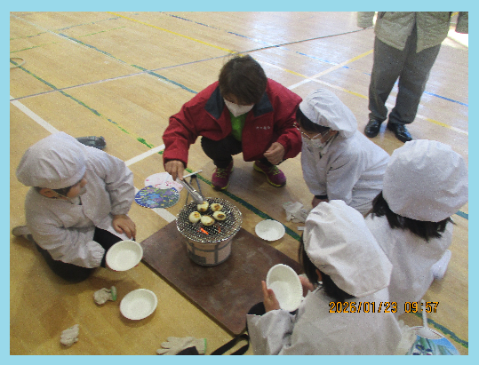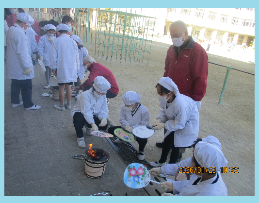 網の上でぷっくりと膨らむお餅を見て、子供たちからは歓声が上がりました。自分たちで苦労して焼いたお餅の味は格別だったようで、「香ばしくておいしい!」「昔の人の知恵ってすごいね」と、五感を通して昔の暮らしに触れる貴重な時間となりました。