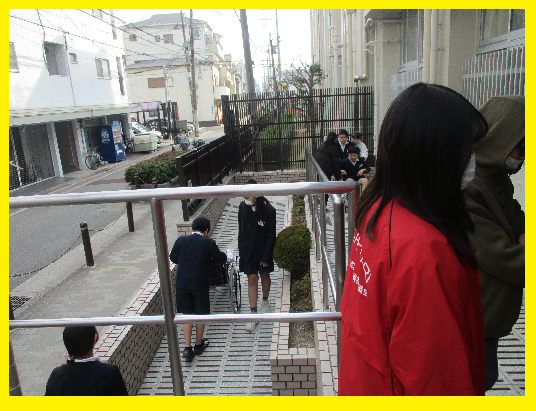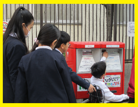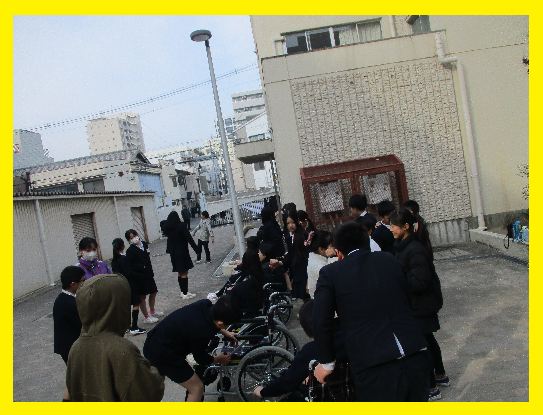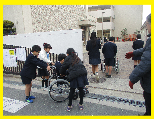 5年生は総合的な学習の時間に「車椅子体験」を行いました。まずは校外に出て、実際の街の中を車椅子で移動しました。普段は何気なく通り過ぎている歩道のわずかな段差や、郵便ポストへの投函など、車椅子に乗った状態では予想以上に大変であることを身をもって実感しました。「少しの傾斜でも怖い」「ポストの口が遠く感じる」といった声が上がり、バリアフリーの大切さを肌で感じる機会となりました。日頃から支援を受けて生活されている方を講師にお招きし、ミーティングルームでお話を伺いました。生活の中での工夫や、周りの人にかけてもらって嬉しかった言葉など、貴重な体験談に子どもたちは真剣な表情で聞き入っていました。今回の体験を通して、自分たちにできることは何かを、これからも一人一人が考え続けていきたいと思います。