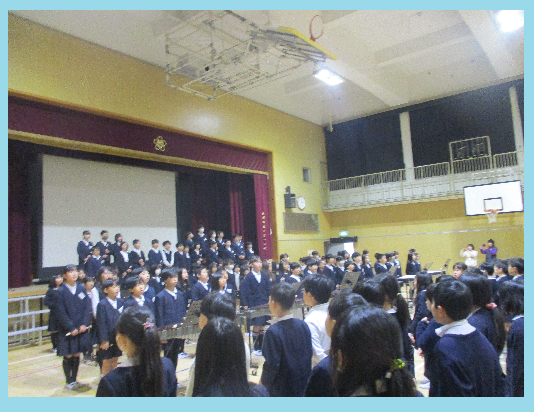 3年生と4年生による「音楽交流会」を開催しました。先に出番を迎えたのは3年生。一生懸命に声を響かせた合唱と、指使いに気をつけながら丁寧に演奏したリコーダーを披露しました。初めて習ったリコーダーの澄んだ音色が、体育館に心地よく響きました。続く4年生は、合唱とリコーダーに加え、木琴や鉄琴などの打楽器を取り入れた合奏に挑戦。曲の途中で演奏者が次々と交代していくダイナミックな演出があり、そのチームワークの良さに3年生も見入っていました。最後には、全員で『ありがとうの花』を合唱しました。学年を越えて心が一つになった、温かい音楽の時間となりました。
