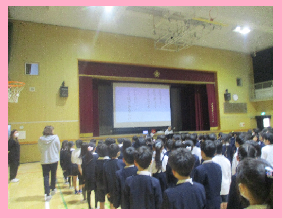 朝の時間に全校音楽集会を行いました。今回は、間近に迫った「またあおう集会(6年生を送る会)」に向けて、1年生から5年生までの在校生が集まり、合唱の練習に取り組みました。練習した曲は、これまでお世話になった卒業生への感謝が詰まった「ありがとう6年生」です。体育館には、低学年の元気いっぱいの歌声と、高学年の美しく響く歌声が重なり合い、素敵なハーモニーが響き渡りました。最初は少し緊張していた子どもたちも、音楽の先生から「6年生との思い出を思い浮かべて歌おう」というアドバイスを受けると、表情が一段と優しくなり、心を込めて歌う姿が見られました。本番の「またあおう集会」では、この歌声が6年生の心にしっかりと届くことでしょう。