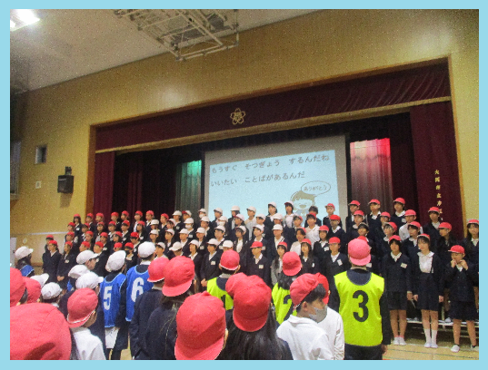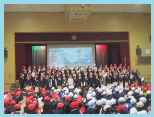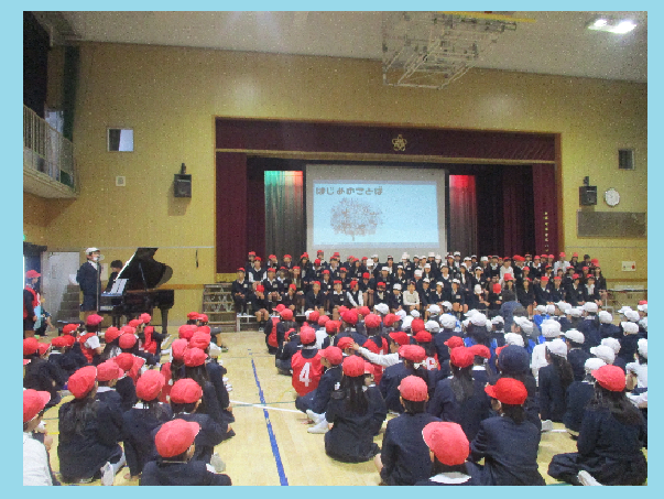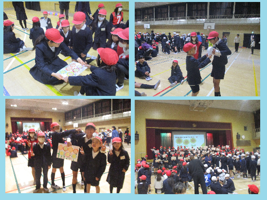 卒業を間近に控えた6年生へ感謝を伝える「6年生とまた会おう集会」が開催されました。朝の集会で全校児童が心を一つにして練習した成果が、いよいよ本番で花開く時です。集会の幕開けを飾ったのは、下級生たちによる合唱「ありがとう6年生」と心のこもったメッセージです。体育館いっぱいに響き渡る真っ直ぐな歌声と、声を揃えた呼びかけには、これまで学校を優しくリードしてくれた6年生への「おめでとう」と「ありがとう」の気持ちがぎゅっと詰め込まれていました。続くゲームコーナーでは、縦割り班の「元気グループ」ごとに分かれて大いに盛り上がりました。「ちょうちょうゲーム」では、6年生と下級生が向かい合い、「勝った!次はサナギだ!」「あ~負けちゃった!」と歓声を上げながら、体いっぱいに表現して楽しむ姿が印象的でした。また、二択クイズの「フィフティーフィフティー(あなたはどっち?)」でも、6年生と下級生が「どっちかな?」と顔を見合わせながら正解を予想し、正解が発表されるたびに体育館が揺れるほどの大きな拍手が沸き起こりました。集会の後半には、下級生が一人ひとり丁寧に模様を描き、感謝を綴った「花びらのメッセージカード」が6年生に手渡されました。6年生は、小さな手から直接届けられるカードを愛おしそうに眺め、照れくさそうに、でもとても嬉しそうな表情を浮かべていました。最後には、6年生からも下級生へ向けて、心のこもった歌のプレゼントがありました。さらに、6年生から下級生へ手作りのプレゼントも贈呈され、互いの想いが通じ合う温かな交換が行われました。笑いあり、感動ありの、本当に楽しいひとときとなりました。6年生が築いてくれた伝統のバトンを、下級生たちがしっかりと受け取った、そんな素敵な「また会おう集会」になりました。