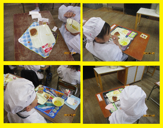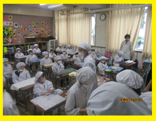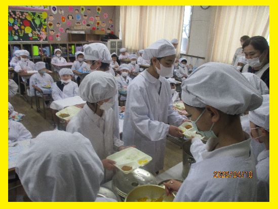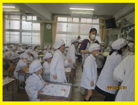 1年生の給食がスタートしました。準備の時間になると、5年生のお兄さん、お姉さんたちが1年生の教室へお手伝いに来てくれました。5年生は、重い食缶や食器を丁寧に運び、「ここに置くね」「ゆっくりでいいよ」と、1年生一人ひとりに優しく声をかけながら用意をしてくれました。高学年の頼もしいサポートのおかげで、1年生も安心して準備を進めることができました。準備が終わると、みんなで揃って「いただきます」。自分たちで用意した美味しい給食を、1年生はみんなニコニコと嬉しそうに食べていました。5年生の優しさと、美味しい笑顔があふれる、素敵な給食となりました。