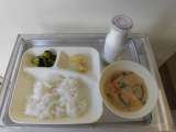 本日の給食は 豚肉のしょうゆマヨネーズ焼き・カレースープ・プチトマト・レーズンパ...