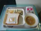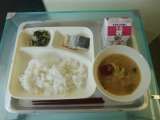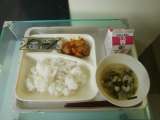 本日の給食は さごしのしょうゆだれかけ・みそ汁・みずなの煮びたし・ご飯・ ...